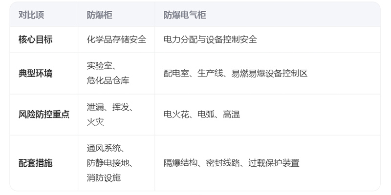 兩者雖名稱相似,但本質屬不同領域的安全設備。防爆柜側重化學品存儲的物理防護,而防爆電氣柜聚焦于電力系統的爆炸防控,需根據實際需求選擇對應設備。