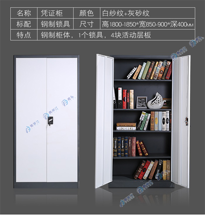 顏色:白紗紋+灰紗紋 規格:高1800-1850*寬850-900*深400mm 用途:鋼制柜體,1個鎖具,4塊活動層板,廣泛適用于各種場所。