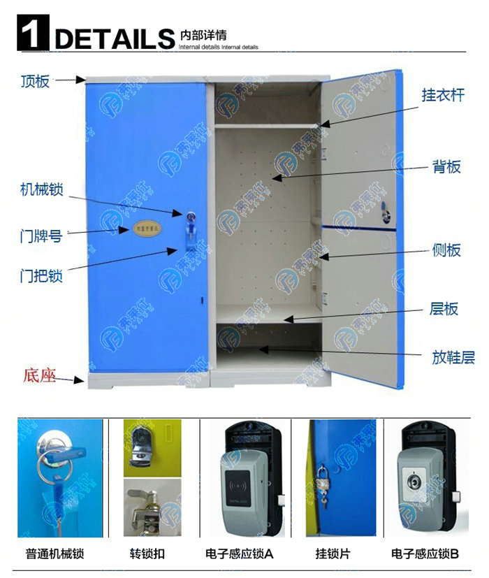 顏色:藍/綠/粉/黃/灰白/橙/咖啡 規格:單門尺寸300*380*500mm 可根據客戶需求定做 用途:多種款式,多種模式,支持定做。適合多種場合:健身房、游泳館、洗浴中心、水上樂園、瑜伽館、員工更衣室等